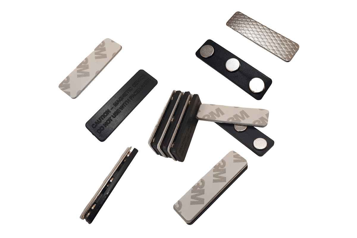 Magnētiskais stiprinājums sastāv no magnētu daļas un metāla plāksnītes ar 3M līmlenti, kas pielīmējas pie nozīmītes aizmugures. Ērti lietošanai birojā, pasākumos un ikdienā; turas pie lielākās daļas audumu.