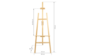 Нижняя полка и верхний зажим надёжно фиксируют холст или доску. Широкий диапазон регулировки позволяет размещать картины разных размеров. Мольберт легко и быстро складывается, что удобно для хранения и транспортировки.